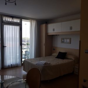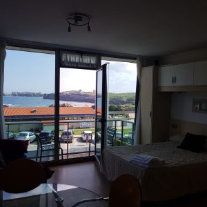 Este estudio destaca por su distribución eficiente y decoración cálida. Con una cama doble y todos los servicios integrados, es ideal para una estancia cómoda junto al mar.